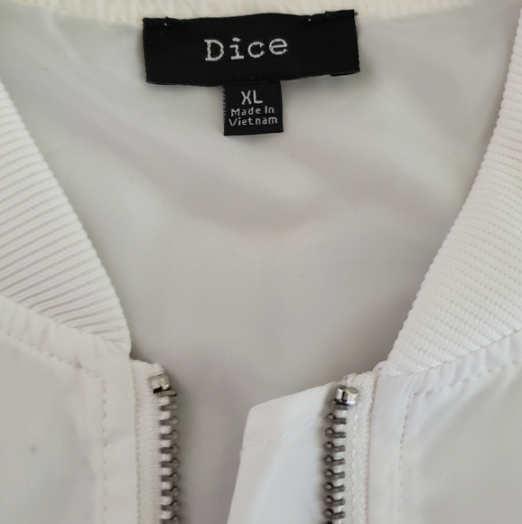 White jacket with black stripes down sleaves. Light weight great for cool summer evening. This is lined. Sporty for dress with a pair of Jean's.