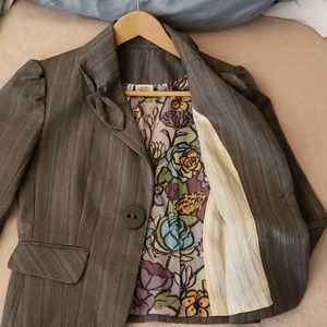 Cute stylish jacket for work or going out. Versatile, goes with almost everything. Super cute with jeans. Mainly gray in color but has pinstripes of blue and a goldish color, very subtle. Size small, falls at my waist, I have broad shoulders and it fits comfortably (for me thats hard to find 😀)