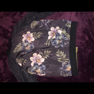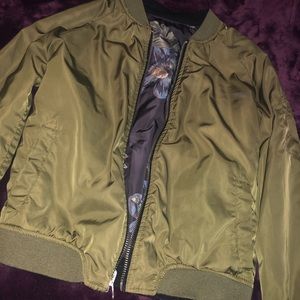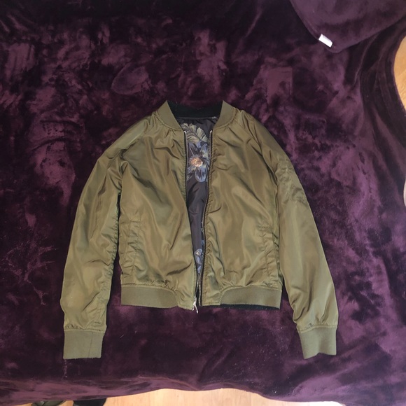 Reversible jacket. Olive green omg one side and navy blue with pink flowers on the other side. Pockets on both sides and a pocket on the sleeve on the olive green side.