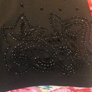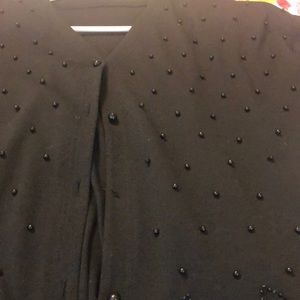 Dressy black beaded jacket with very pretty detail beaded design along the edge of the front and the back is plain there is one button missing, solid beaded front diamond pattern all of those are there none of those are missing.