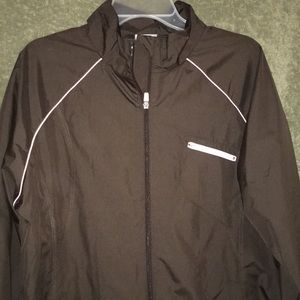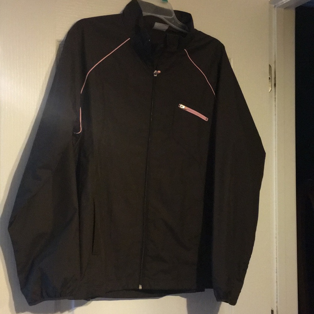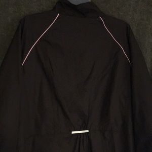 Chocolate brown with some pink trim light weight,zip up front. Regular front pockets and a small zip up pocket on chest. Has a little bit of a gather on back at lower back with a reflective strip