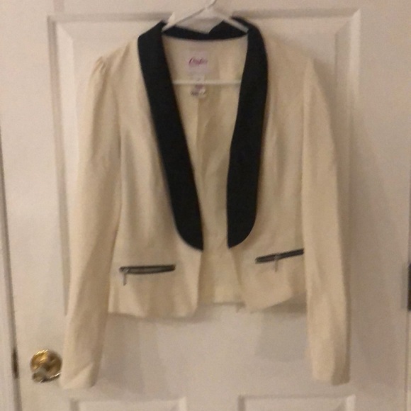 White jacket with black lapel and zipper pockets
