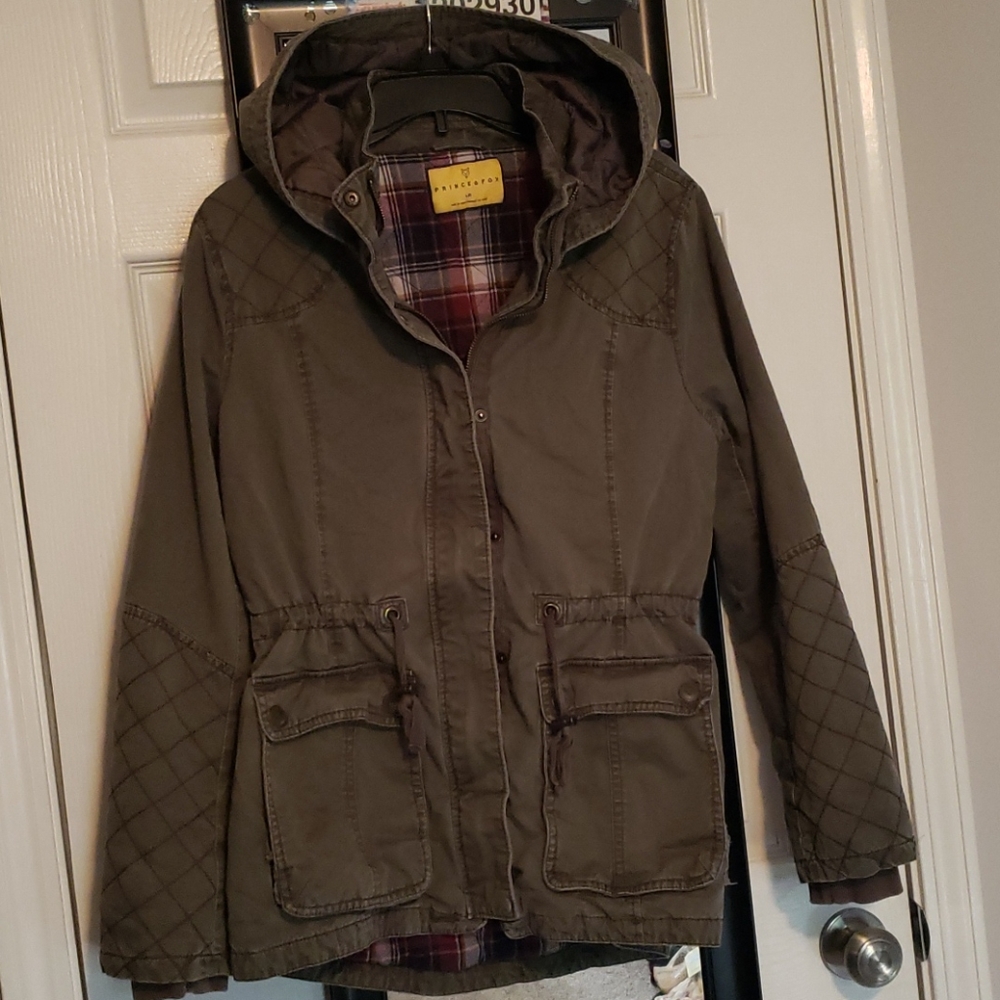 Army green exterior with red plaid interior winter jacket. Adjustable sinched waist with buttoned pockets. Zipper and buttonable front.
