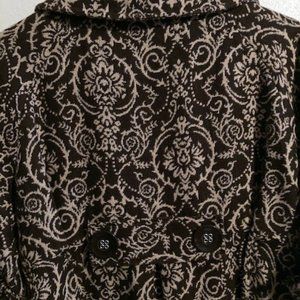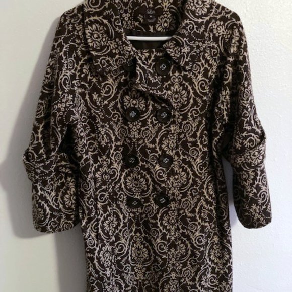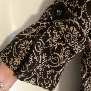 Brown and ivory embroidered lined jacket with exquisite details. Great buttons (double breasted front), buttons on sleeve and back detail. 3/4 sleeves that flair. Very feminine. Looks great over a short skirt, leggings, jeans. Or as a top coat in cooler months. (The photo doesn't do it justice -- it's a great stylish shape, a statement piece, with awesome detailing.)