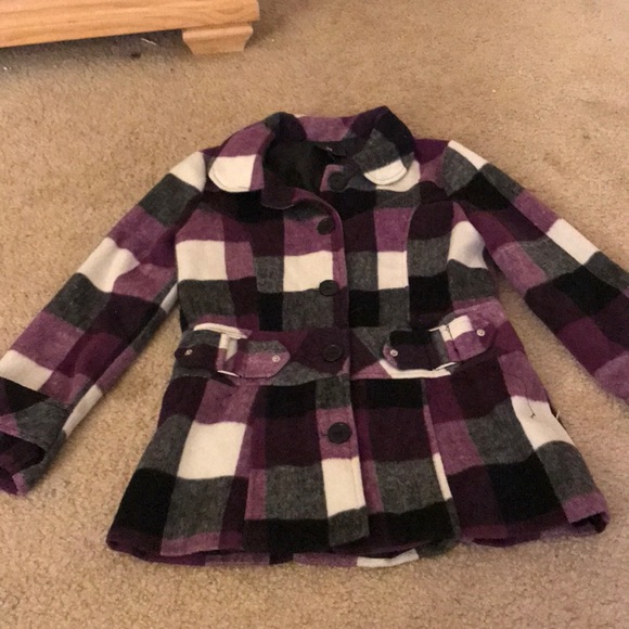 Cinched waistline, purple white and black plaid design, long sleeves, button up