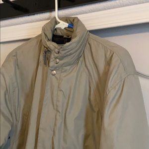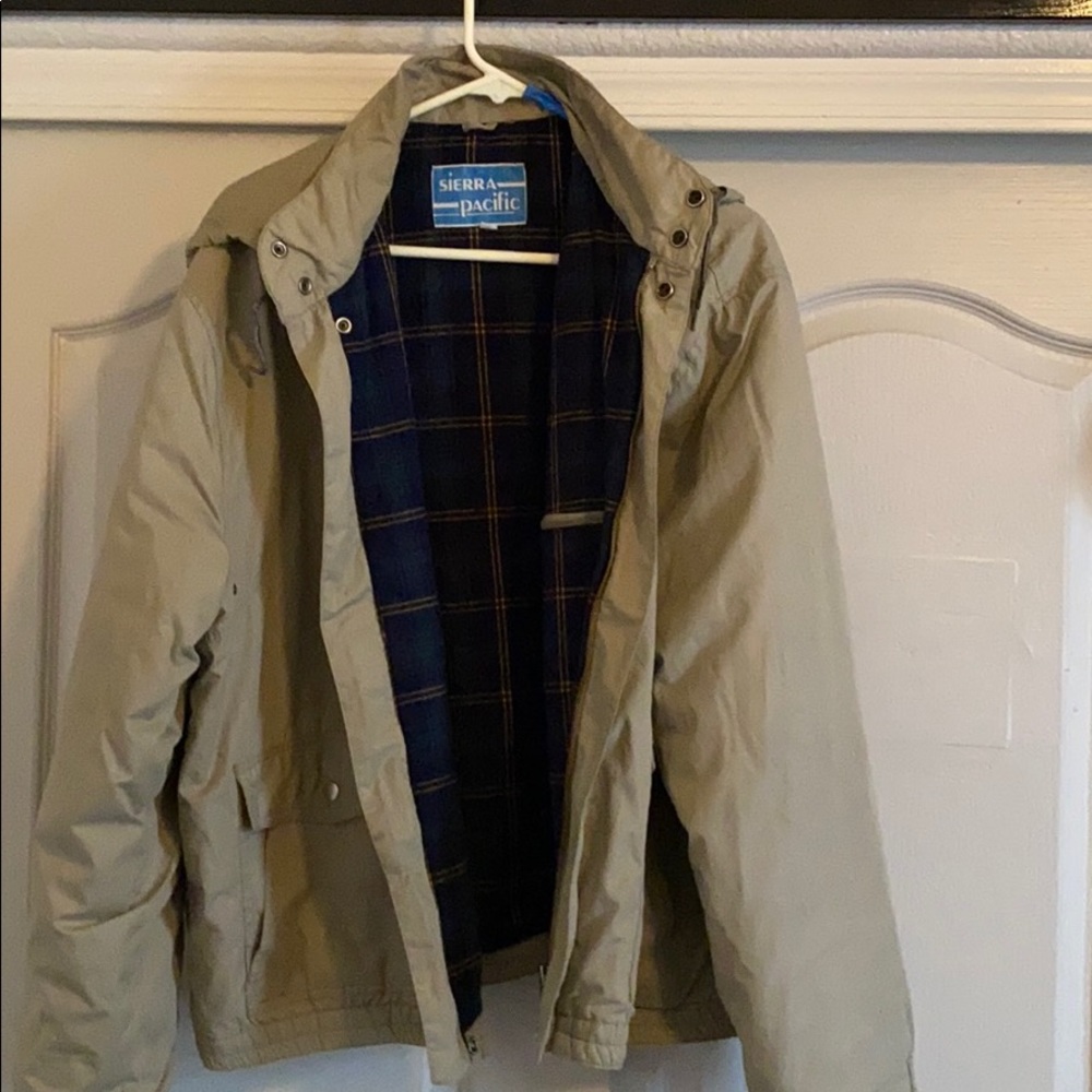Tan jacket with nice Warm liner has one zippered pocket on the inside two pockets on the outside and a zippered hood nice condition nice jacket all snaps work great as well as a zipper