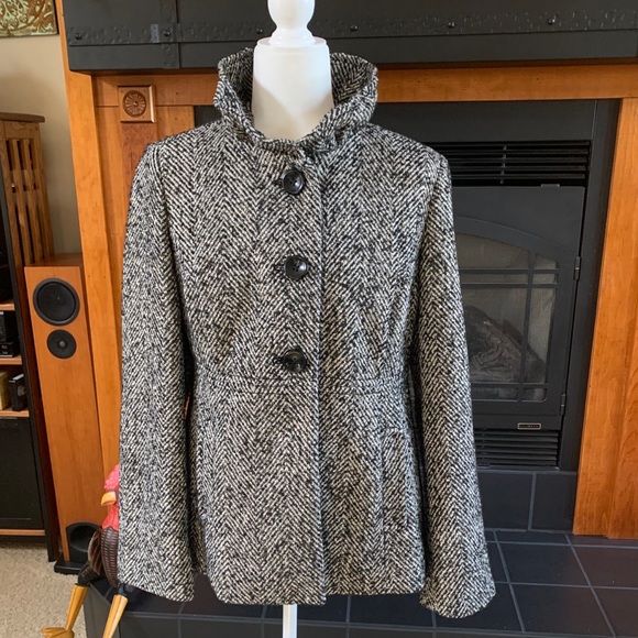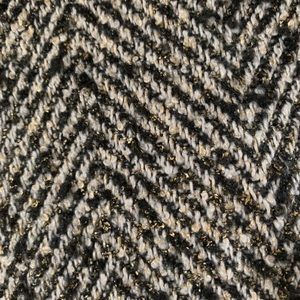 Black and White houndstooth print ruffled collar jacket. Subtle gold threading throughout. Slightly flared bottom.