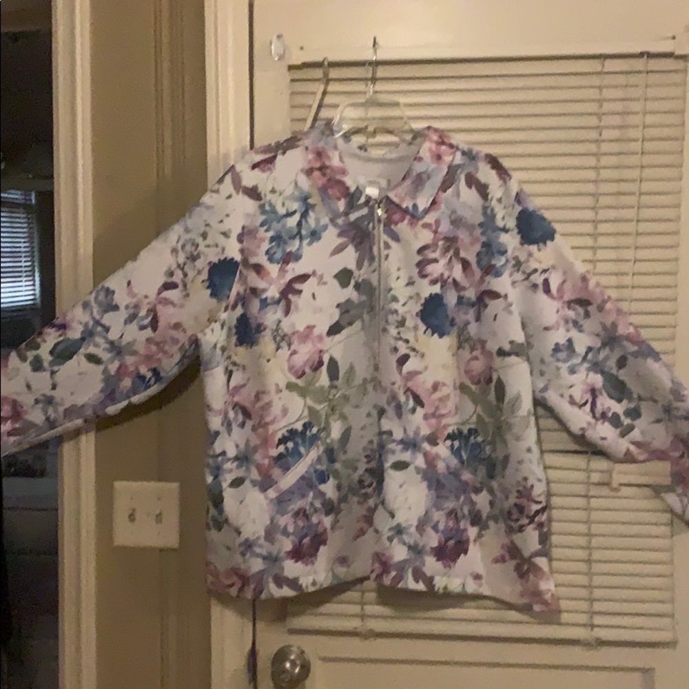 Very nice floral print jacket with 100% polyester lines and partial cotton exterior. Comfortable yet dressy.