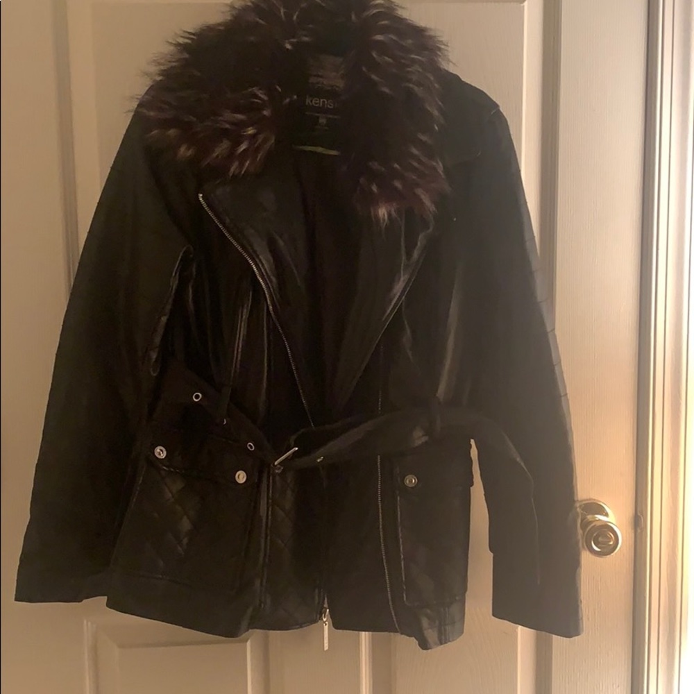 Faux leather belt buckle some wear on inside of belt can’t see it though other then that like new .fur on collar comes off . Comfy
