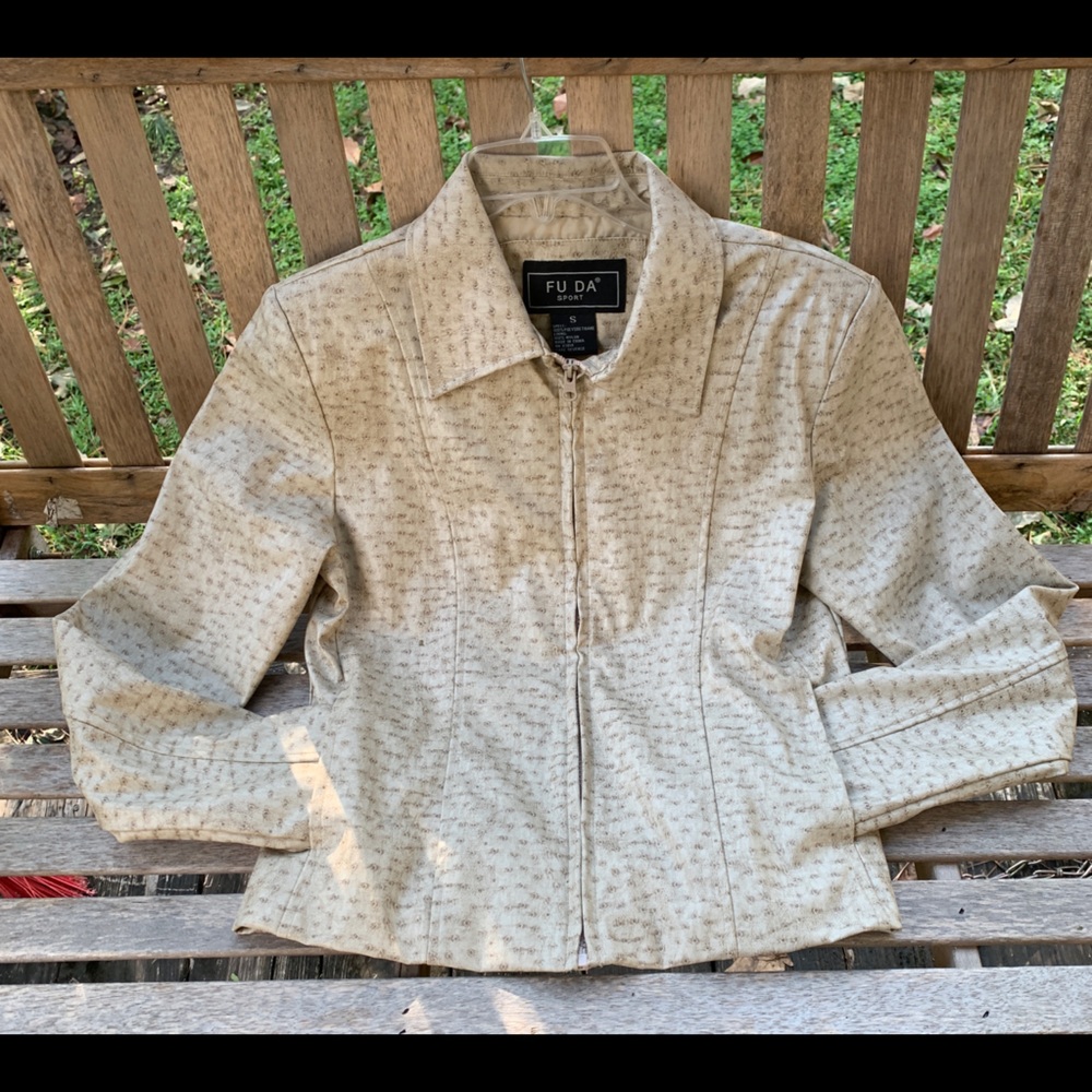 Fun, vinyl jacket. Side pockets. Perfect with jeans or leggings. Excellent condition - never worn. Beige with brown marks. Beautiful jacket for someone’s wardrobe.
