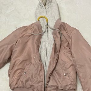 It’s pink and white it’s very comfy and cute I love it but I’m just trying to make extra money it’s like a bomber jacket. It’s fuzzy in the inside.