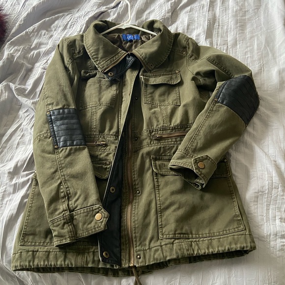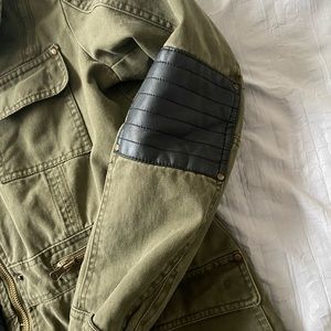 Olive green jacket with pleather accents and gold zippers. Only worn about 8-10 times