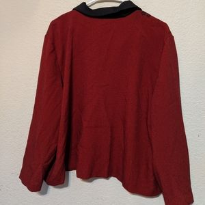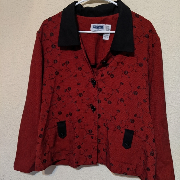 Red button up jacket with black flowers
