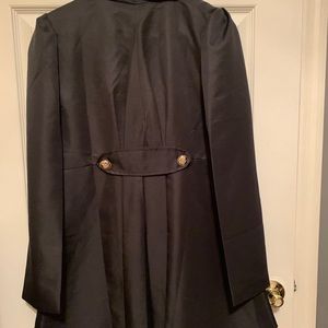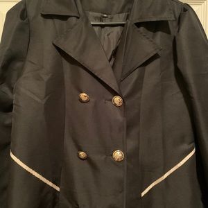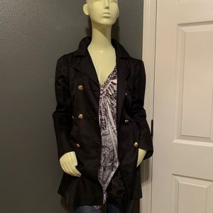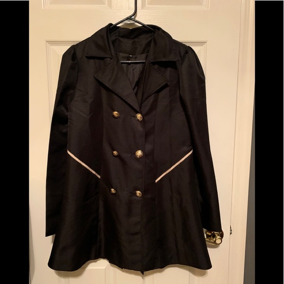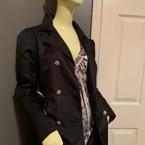 Hi , this is a lightweight but lined double breasted jacket . Has gold buttons and a gold sparkle material by wear pockets should be. There is no pockets though. The sleeves are dressy with a slight puff at top(see mannequin photo) and this jacket runs small and cut for juniors. Very cute though