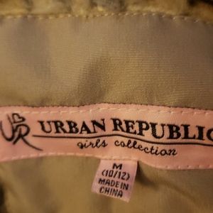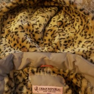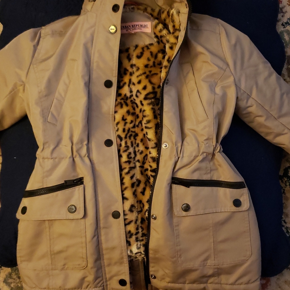 Little girls tan jacket with detachable hoodie,leopard print faux fur lined and water resistant.