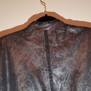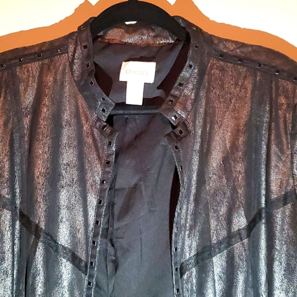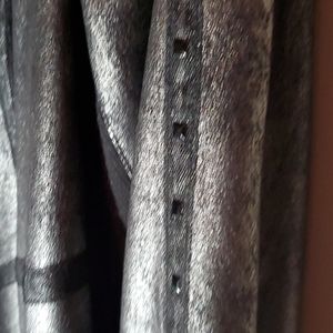 Pewter colored long jacket approx 2 inches above the knees. Black rhinestones down the front and down the arms and around wrist area. Has a mandarin collar and a black webbing horizontal and vertical strip.