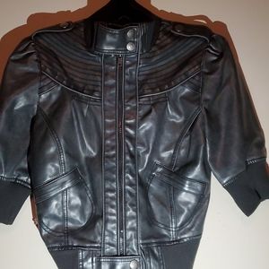 Distressed black waist length fitted jacket. Short sleeves, just at bend of arm.