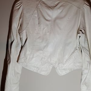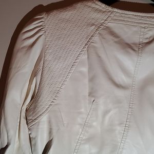 Cream faux leather asymmetrical jacket. Mandarin collar, roughed sleeve 2 hidden button closure.