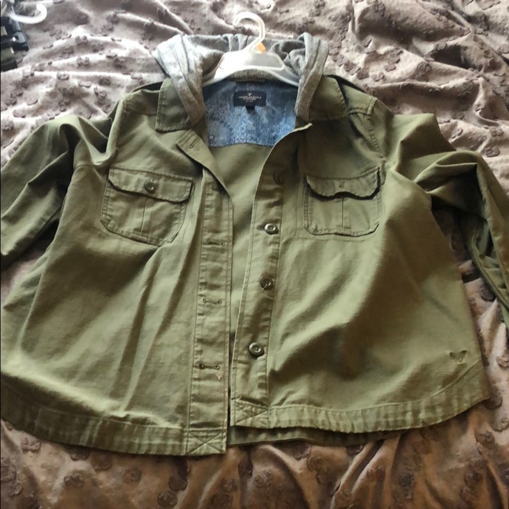 Jacket with a grey hood! Has a stain but can wash it right out