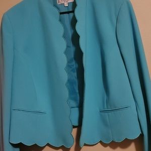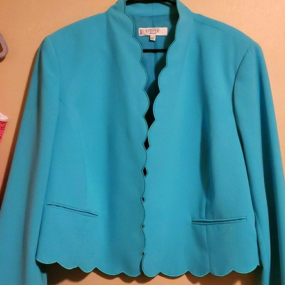 Gently used Kasper Woman jacket Scalloped edges Size 22W Color is either mint or turquoise Has 2 false pockets in the front