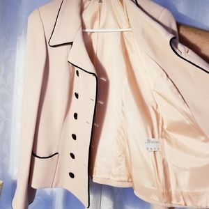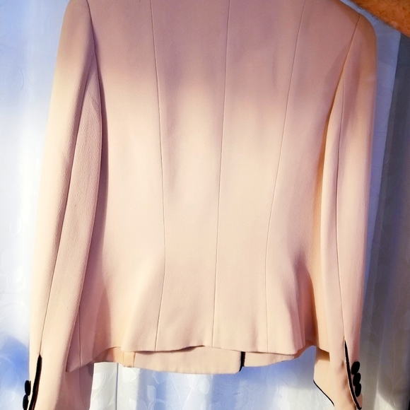 A few questions for you: 1) is the color more pink or more blush? 2) is the piping velvet? 3) Are the buttons covered in the same fabric? 4) Can you post a pic of the jacket fully buttoned? Thanks!