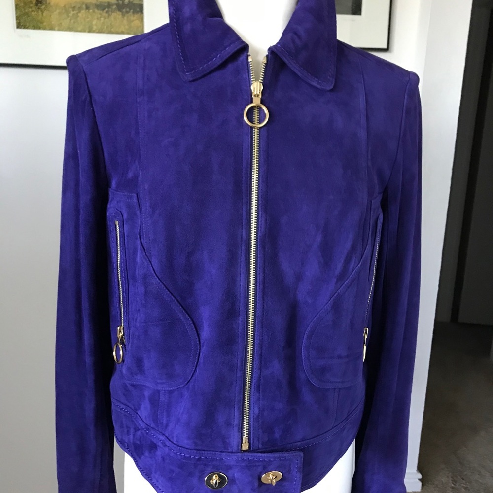 Royal purple Italian suede leather jacket with brass zip and pocket closure, zip pocket closure. Cowboy jacket cut. 20.5” in length. Lined. Worn once.