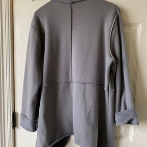 Chico’s light weight jacket. Fleece inside, nice detail of outside seams as seen in photo. Front drapes slightly longer than back. Size 2 in Chico sizing which is a 12-14 in normal sizing.