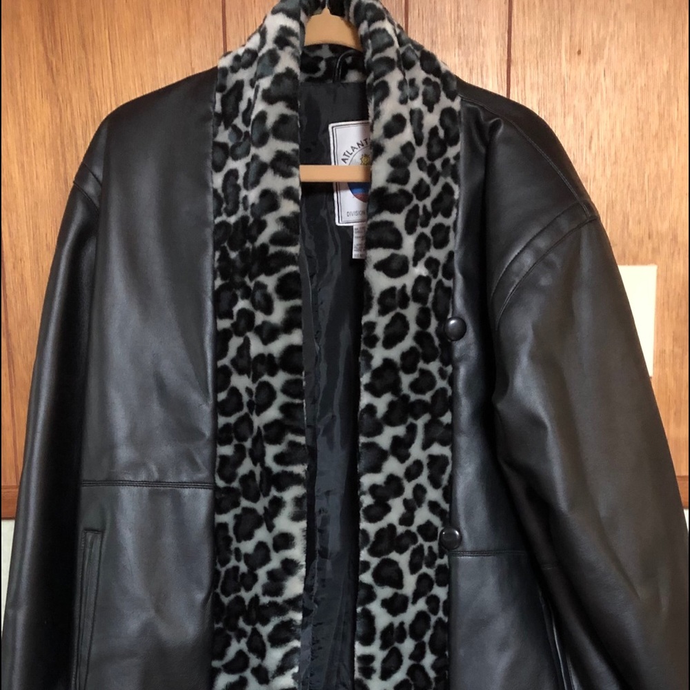 Atlantic Beach winter coat. Black Leather Coat with faux fur collar..measures 34” long from the shoulder, the back has a little scuffs that I showed in the picture not real visible.