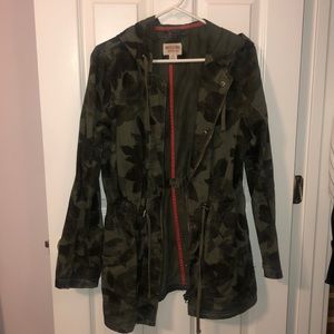 Green and black print zip up jacket. Has waistband that tightens. Jean material.