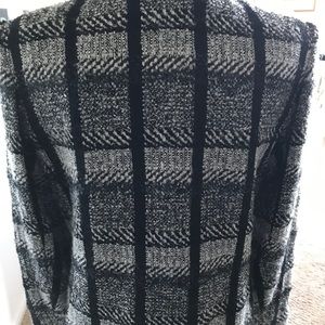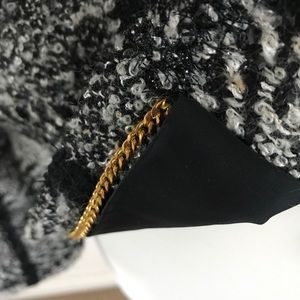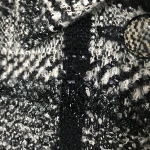 Black and White boucle’ wool jacket. Dressy fabric. Specialty button at collar and hidden buttons in placket. Chain link at the jacket bottom to keep hem in place.