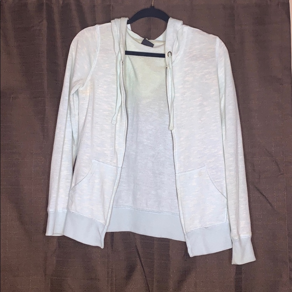 Light blue zip up jacket with pockets on the front and hood. No stains, rips, or tears.
