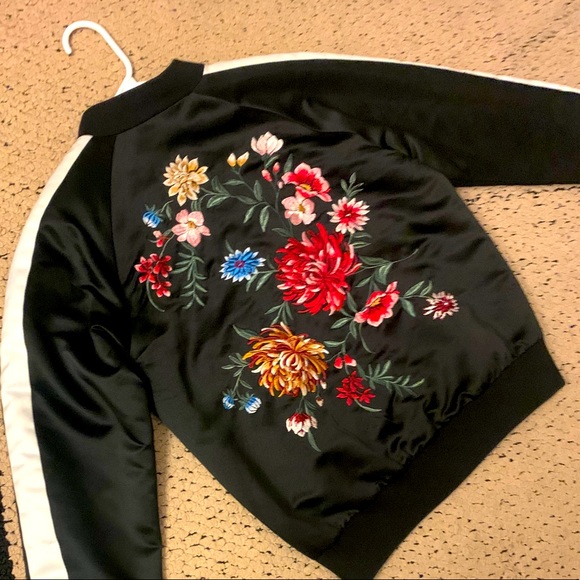 Black and white jacket with flowers on the back side worn but looks new and in perfect condition.