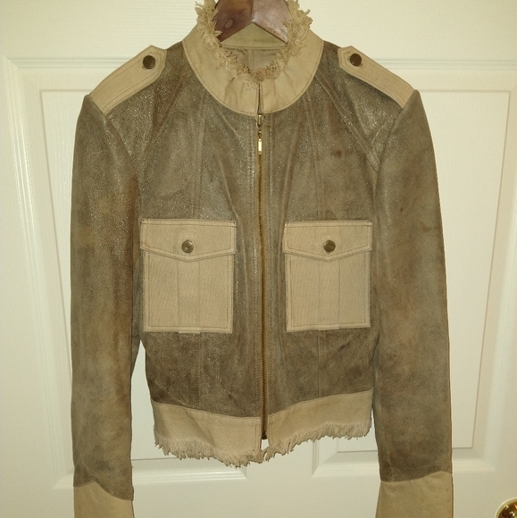 Oatmeal and Tan leather and cotton jacket with shoulder lapels and two front pockets. Chinese collar and front zipper.. Worn a few times and in great condition. Nice jacket to pair with jeans, skirts, shorts and leggings.