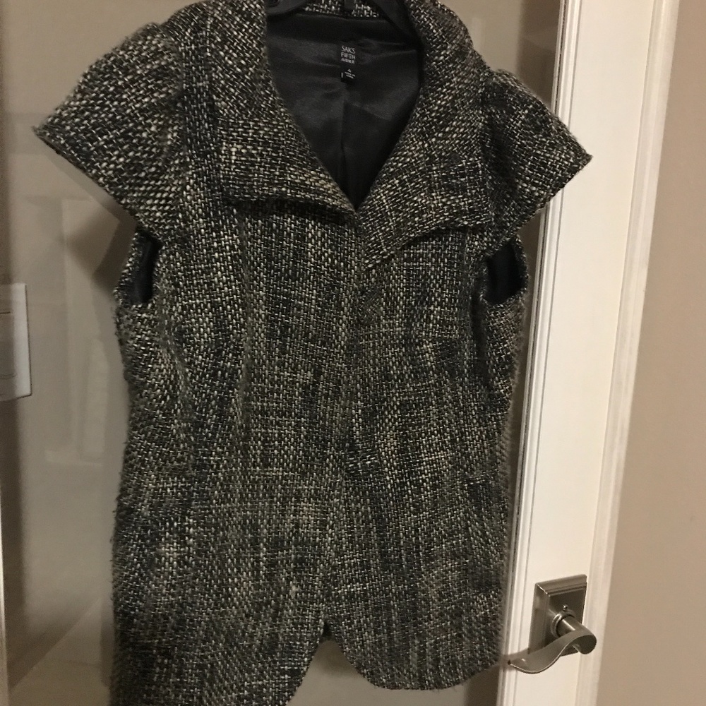 Black and white tweed jacket with three large covered buttons on the front and two side pockets. Capped sleeves make this a must have for spring.