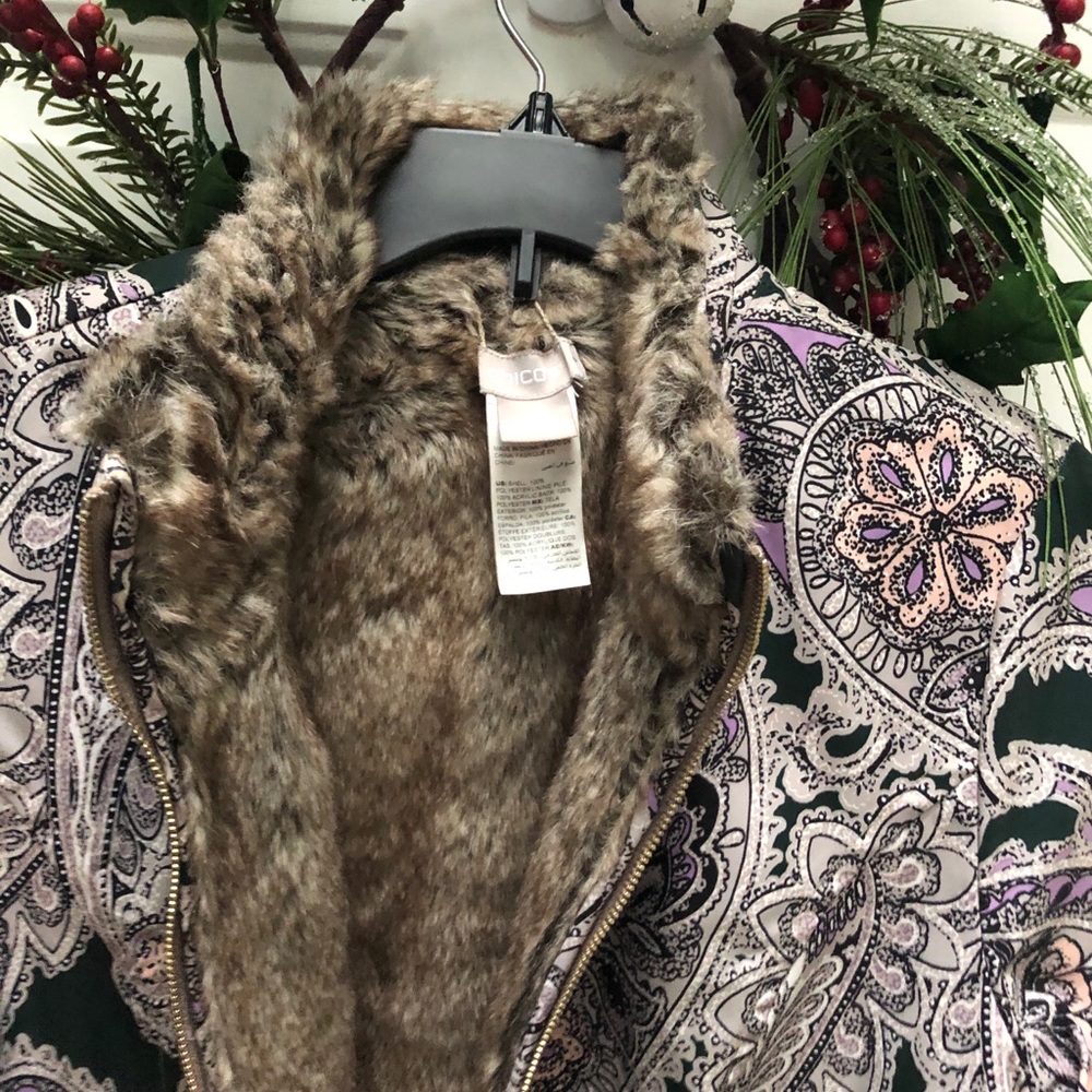 Worn once just too small. Equal to a 6/8 but Chico’s sizes differently. Fur lined and very warm.