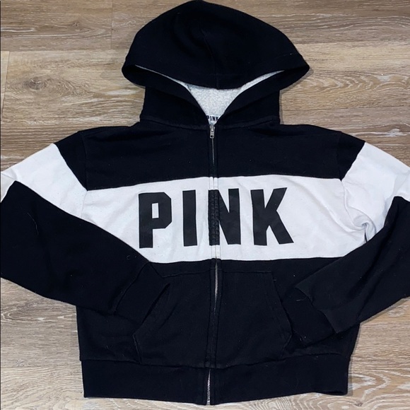 White and black jacket that says pink on it with fluffy hood