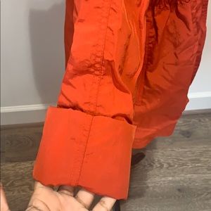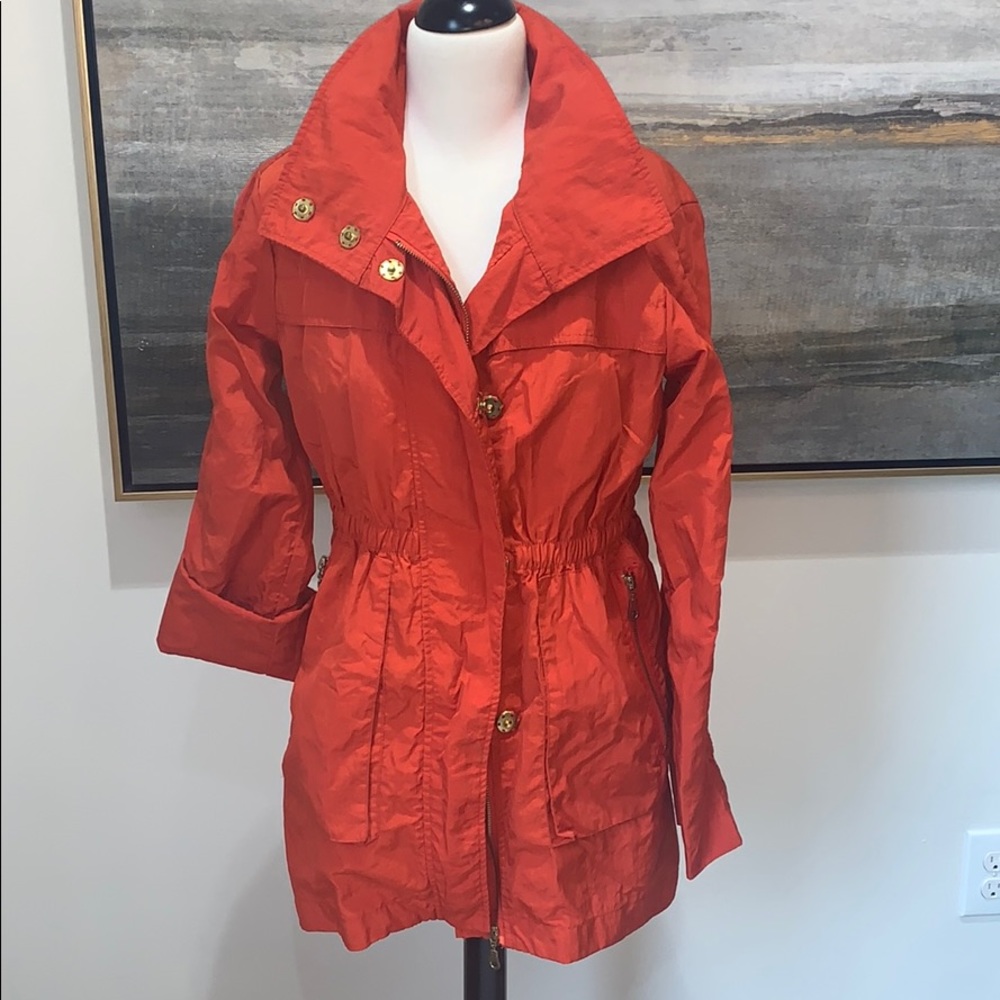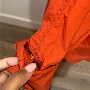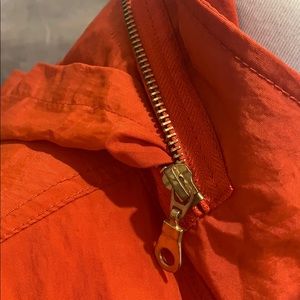 Orange nylon jacket. Lined with gold metal zipper and buttons. Hood folds into zip closure by the neck.
