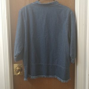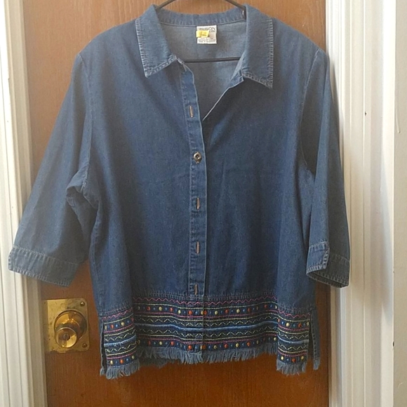 Jean jacket 3/4 sleeve length. Embroidery and fringe trim