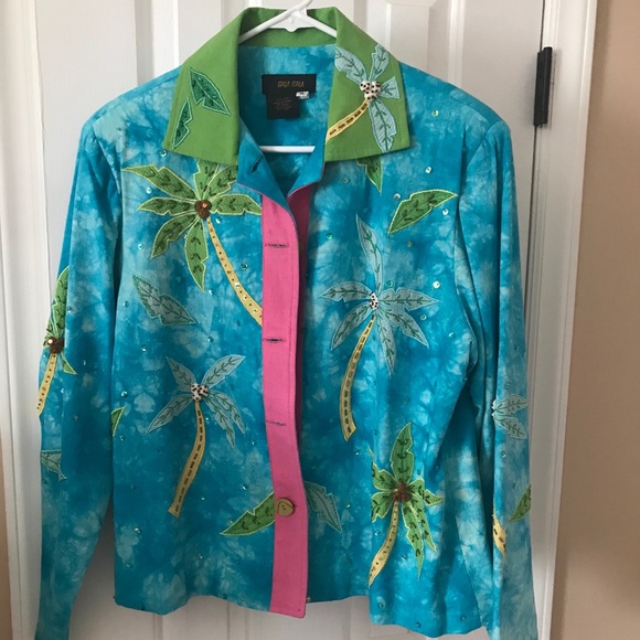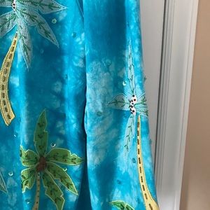 Pretty Island or beach wear. Coconuts and palm trees are so real looking makes me want to go pack for beach. So fun to wear. Worn just a few times. Worn twice.