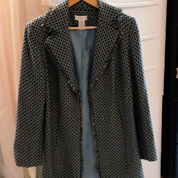 Worthington jacket used 2x. Dressy, could go out at night in this and also a business jacket. 14w. From smoke-free home. Absolutely incredible jacket, perfect condition. Green satin interior, long length, tiny fringes on some edges and is washable!