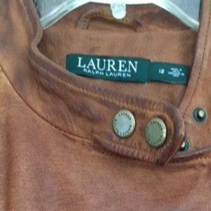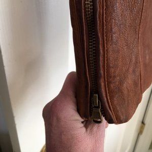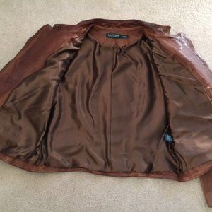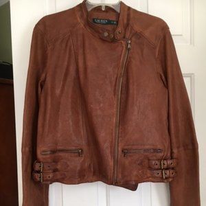 Beautiful soft leather jacket. Best condition possible; worn once. Great detail in all pictures; zipper front; zipper on bottom of sleeves. Dark tan/camel in color. A beautiful jacket.