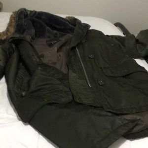 It’s army green soft cozy very warm it’s a small but feels more like a medium - has hood that zips down - great pockets made by Gap