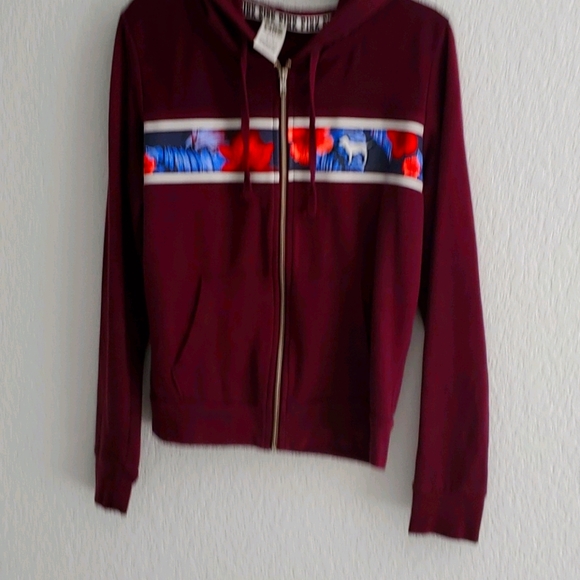 Burgundy with Hawaiian design. Zip up with hood and pockets