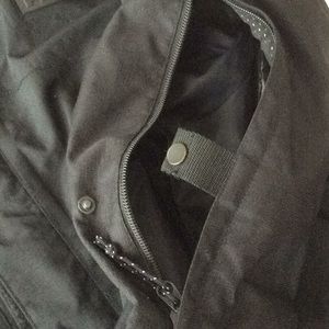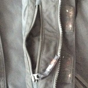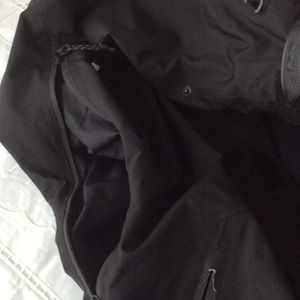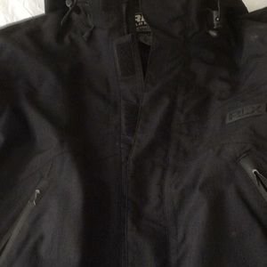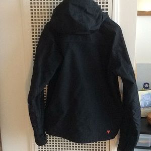 This is black RLX Polo sport jacket in size small.It has a front zipper and Velcro closure. It has one inside and tow outside pockets with zipper closure.It has two sections of zippers on sleeves that can be opened for more comfortable movements.It has an attachment hood. The sleeves have adjustable Velcro closure.