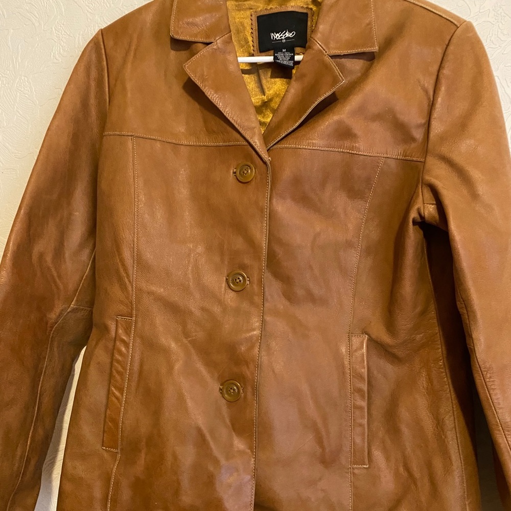 Leather jacket, this jacket is in perfect condition- no wear on the cuffs or bottom. The satin lining is pristine.