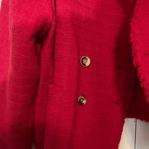 Red eye lash trimmed jacket with gold buttons