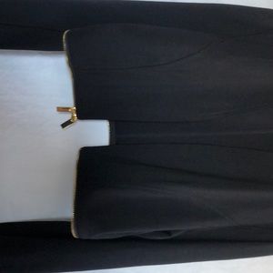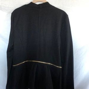 Black, Iman jacket. Unzip the peplum bottom and converts to a short jacket. Gold zipper. Hook closure at waist