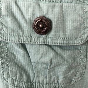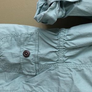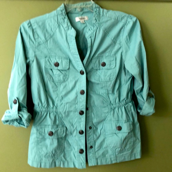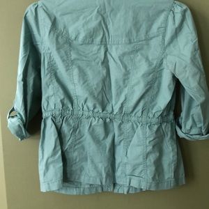 Safari looking top layer with cinched waist and nice brushed chrome buttons. 3/4 sleeves and stand up collar. Mint green, great lighter layer and spring color