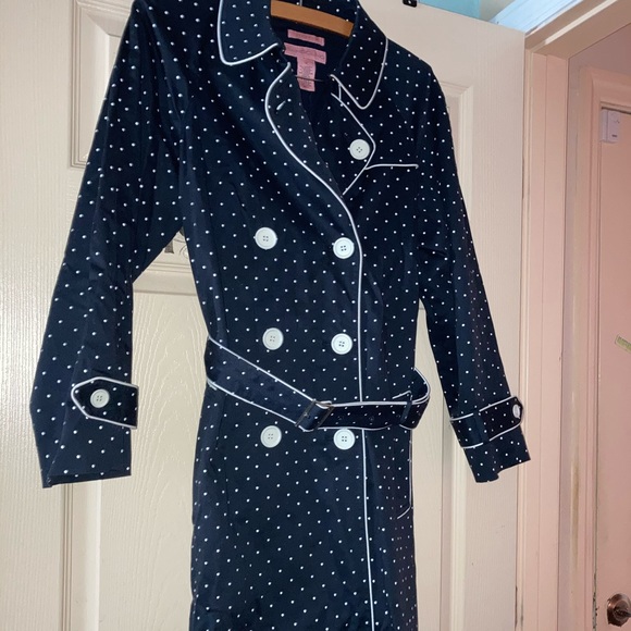 Longer trench coat style 38” long with 25” sleeves. Navy blue with white polka dots. Bandolino brand