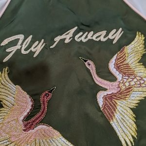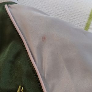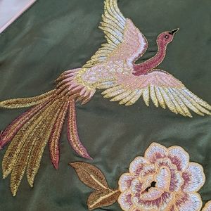 Silk feeling, green, pink, white, glitter, birds and flowers sewn on the back. Will need to be dry cleaned. Make an offer.